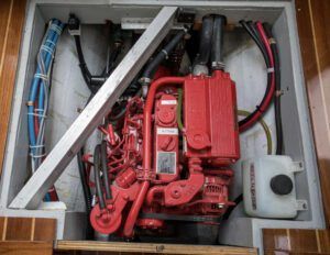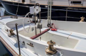 Built in the era before pans and liners dominated interiors, these “stick built” accommodations were more time-consuming to build, but each bonded gusset and tabbed-in bulkhead added additional support to the hull and deck. This approach also allowed access to more of the inner surface of the vessel. However, some surveyors frown when they lift cutouts in the cabin sole and see tanks preventing inspection of much of the bilge area. The good news is that the encapsulated ballast has no keelbolts to inspect, and the tanks, at least the ones in the earlier hulls, were monel, a nearly inert metal that’s the material of choice for tanks, shafts, and heat exchangers. Unfortunately, its cost has skyrocketed and made its use all but disappear from the waterfront.
