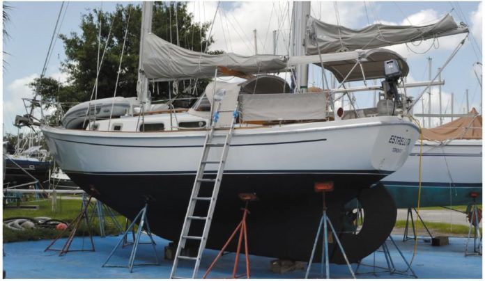 The ballast is lead, molded to shape and glassed into the keel. While this technique eliminates keel bolts, it also makes the fiberglass hull more vulnerable to grounding damage.