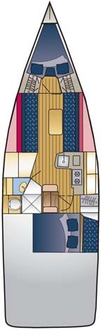 The interior layout is quite traditional, as is the styling. The saloon is arranged around a large teak table fixed on centerline, which has drop leaves ample enough to seat six people in relative comfort. To port and starboard are full-length settees that can be used as berths if required. Outboard of these are storage compartments and shelves.