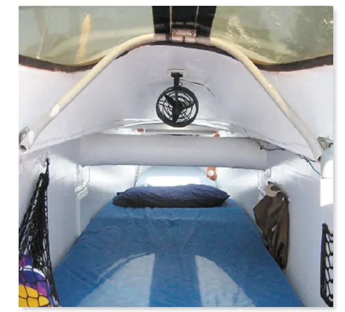 The Stiletto has the narrow hulls of a fast catamaran, which means that its berths are only 31 inches wide (twin size) but are extra long (14 feet), with one in each hull. There is stowage space under the berths.