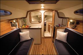 Morris Yachts was doing well building quality cruisers when a wooden 1930s vintage 34-footer named Poppy was consigned to the yard for restoration. Designed by Sparkman & Stephens, the boat was resurrected to the point where it became the “boat of the fleet” at S&Ss 75th anniversary, a reunion that included such icons as Bolero, Dorade, Stormy Weather, and other classics. When Morris Yachts founder Tom Morris (who passed away in December) came upon an updated version of Poppy in the S&S files, he and his son, Cuyler, president of Morris Yachts, set out building traditional weekenders with sitting headroom, belowdecks sheeting, and no lifelines. They sell for “about $350,000” and are closing in on number 30.