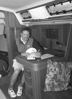The nav station offers a seat facing forward, under which is a storage area, chart table, large electric panel and bulkhead with room for VHF, SSB radio, and other electronics. The papers and tools that inevitably accumulate at a nav station may be stored in the 2′ 3″ x 3′ 1″ table, outboard in an open cabinet, and in three drawers below the table, some of which will probably be reallocated for galley tools.