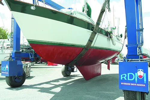 Rather than molding the skeg as an integral part of the hull, a steel weldment was encased in a two-piece fiberglass shell filled with high-density foam and mish-mash. The skeg was then epoxied to the bottom of the hull and bolted in place with stainless steel bolts, nuts, lock-washers, 5200 and a backing plate. Valiant glassed over the skeg again once it was in place to cover the seam. This type of skeg construction is very strong and should provide adequate protection if you hit a submerged object or run aground.