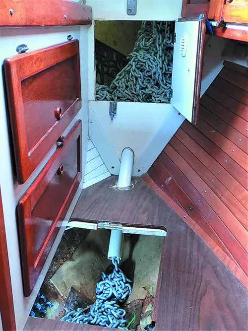 - A PVC chain pipe leads chain aft into the forepeak, but is prone to jamming. Some owners cut acces slots at the top for easy unjamming.