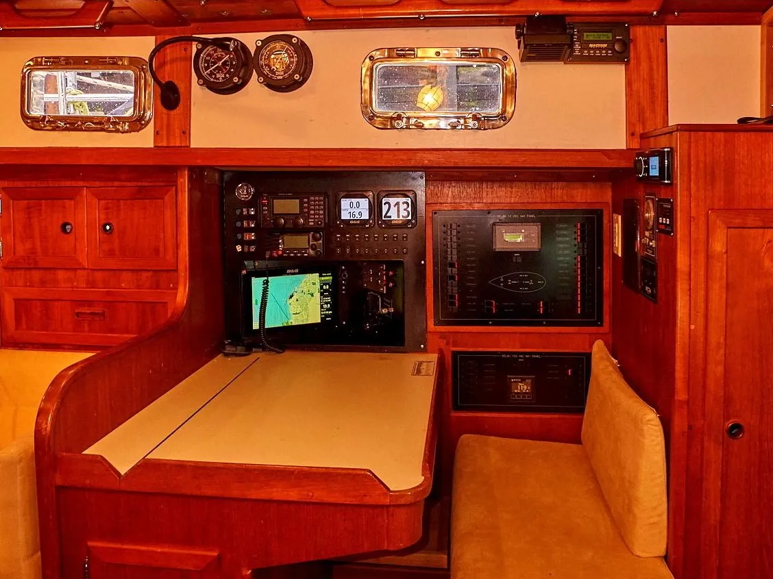 For lightning protection, Valiant grounded the chain plates and mast base to the keelbolts. A single sideband counterpoise, consisting of copper strapping tied to the keelbolts is also available as an option.