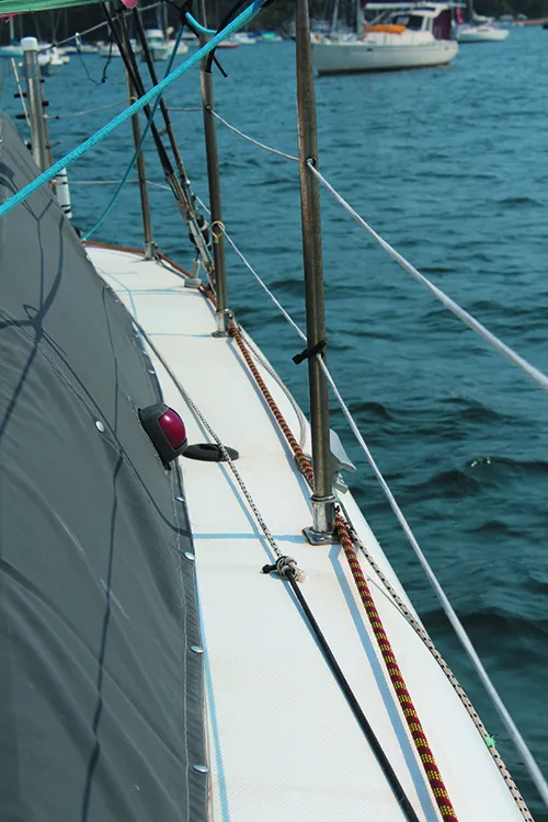 From the turning block at the bow, each snubber leads aft through the struts in the stanchion bases. The snubber then passes through a clutch near the transom, then through a turning block on the transom (a spinnaker or screecher block is ideal), and then to a cockpit sheet winch. You don’t need a clutch. You could secure the snubber to cam cleat, a clam cleat, or even a horn cleat. The ‘spare’ end of the rope we stored as we would a sheet, in a bag hung from the lifelines.