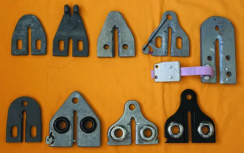 1. Bridle plate development : the original Frye/Neeves plate, a plate with claw incorporated, a 7075 plate home-anodized, a 7075 plate with gate, a four-snubber plate with a clumsy silicone gate. Bottom , profession-ally made 7075 plate, an untreated 7075 plate (with safety gate). An untreated Bis 80 plate with 316 two-part rings and, finally, the 2205 duplex alloy, black painted plate with 316 two-part thread rings with recess for gate.