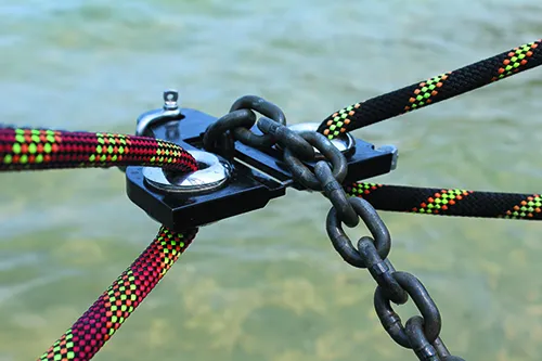 Our bridle arms are made of climbing rope, each 30 meters long with about 40-percent elasticity to breaking point. They quell chop, subdue yawing, and absorb large snatch loads. In our case, they do all this with a rode of 6mm G80