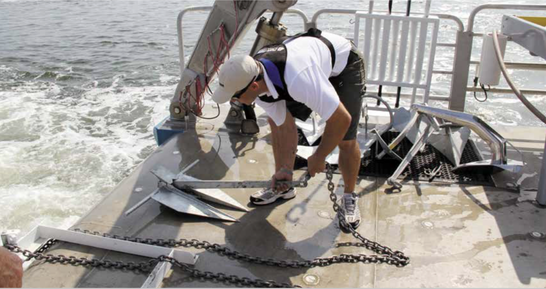 Initially, testers had considered using the engines of the vessel to set and load the anchors, as had been done in previous tests. However, to eliminate the wide variability attendant to this method, the team relied on the boat’s ability to hold steady in a single spot. While the engines held the boat in place, testers used a stern-mounted winch to apply the load.