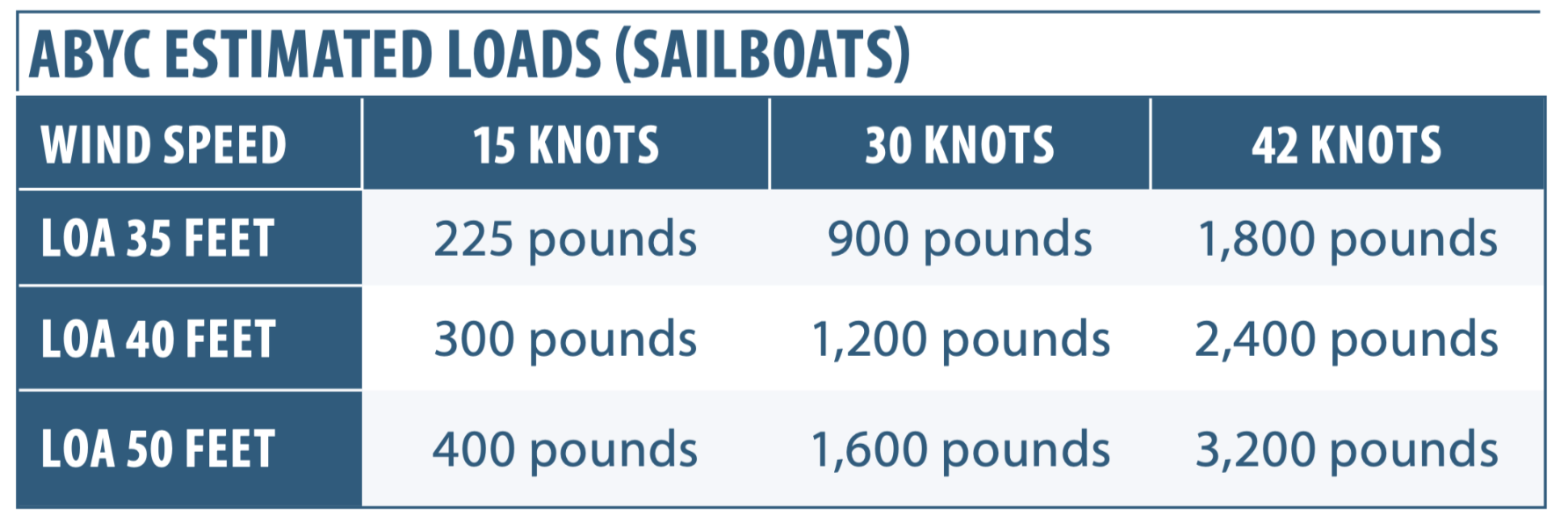 It also is worth noting that our own tests (see “Anchor Snubber Shock Load Test“) have shown the ABYC data to be very conservative (as much as three times the actual loads), but we see nothing wrong with a healthy safety factor, especially when it comes to anchoring. And one needs to keep in mind that the ABYC data does not include wave-induced loads.