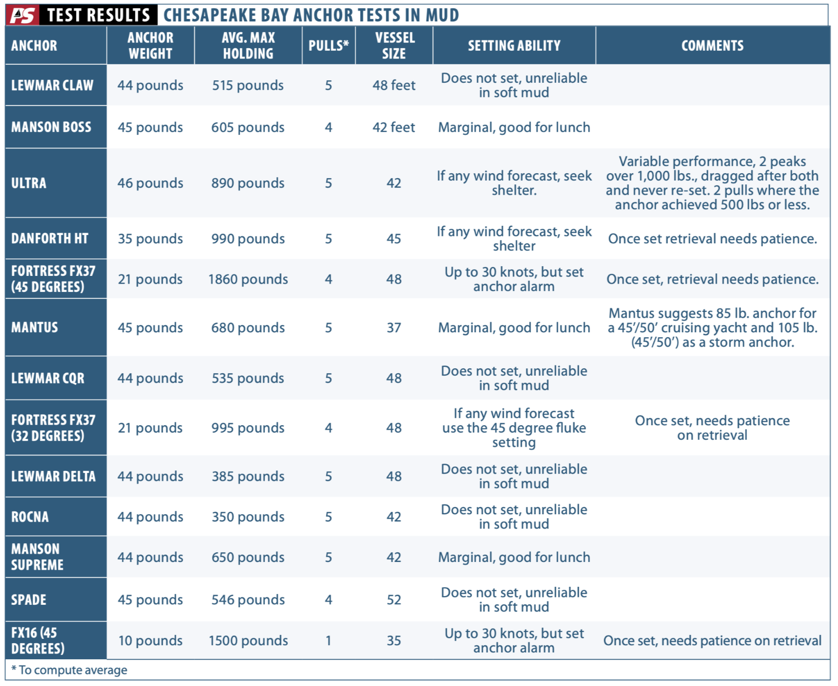 Average holding power (collated from the raw data provided to Practical Sailor) for each of the anchors is in the accompanying table.