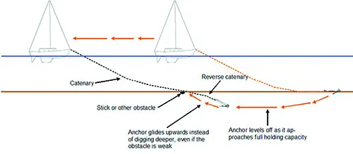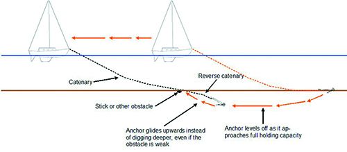 The assumption has always been that buried trash and weak areas in the mud are the culprits. In our testing, the cause of holding failure, if we dragged far enough, was nearly always a stick in the mud that guided the rode of the buried anchor back to the surface. It didn’t need to be a strong stick, only enough to change the pull a little bit, creating the effect of short scope. Although sticks never came to the surface with the anchor, each time we dove on the anchor after failure, it was still there, snapped or pushed to one side. When the anchor reached the surface the anchor would suddenly lose grip and surge out of the bottom, the result of energy stored as rode tension.