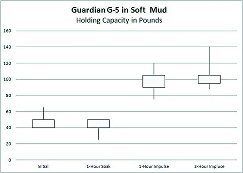 - Gray blocks show the average range of maximum hold for the Guardian G-5. The anchor’s average maximum hold saw little or no improvement after 3 hours.