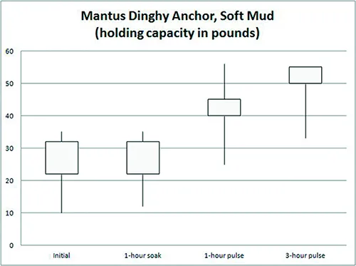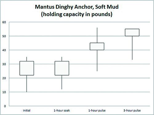 - Gray blocks show the average range of maximum hold for the Mantus Dinghy Anchor. Long duration “pulses” applied after 1 to 3 hours proved effective.
