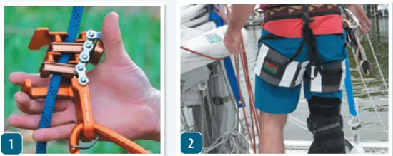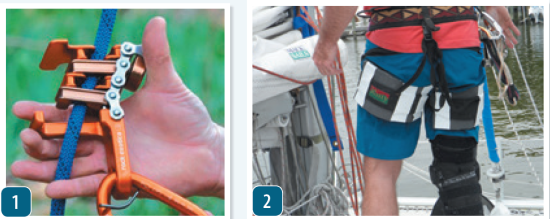 Another ascender, often referred to as a knee ascender, floats at about knee height, suspended between a harness to the other foot by a length of bungee cord that is routed up through a carabiner or small block on your waist harness, and back down to the foot ascender. Both of these ascenders are completely self-tending. You march up the rope, hardly thinking about what your feet are doing, with your hands free to grab the rope, mast, or anything else that will help your progress and prevent swinging—a real nuisance in the harbor, and a serious danger underway.