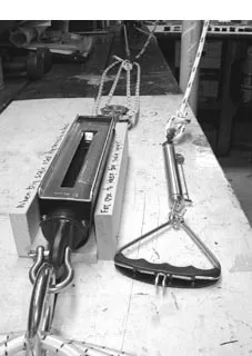 At the pulling (or fall) end, a smaller Chatillon Model IN-50MRP (which has a maximum needle) was attached to the fall. For ease in the repetitious work, the scale (which has a maximum of 50 pounds) was fitted with an RWO Model R4110 trapeze handle.