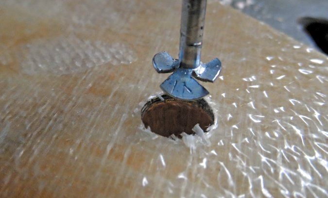 A modified roofing nail is perhaps the most versatile tool for removing core when sealing fastener holes. It is much easier to control than bent nails or cut-down allen keys, which can jump around as they spin. Core removal is more uniform. Wood chips are finer and easier to remove. It is faster than a Dremel cutter and undercuts twice as far.