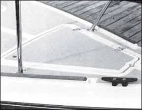 Another type of specialized anchor well is the molded fiberglass vertical well fitted for a particular size and type of anchor. We first saw this on the J/30, which has a well on the side deck designed to carry the Danforth anchor that is the class standard. The well has molded recesses for the stock of the anchor, so that it is securely held in place. The advantage of this arrangement is that the vertical well takes up less deck space, so that its location is more flexible. The disadvantage is that there is little flexibility in the ground tackle you can carry. You’re pretty much stuck with whatever anchor the locker is molded for.