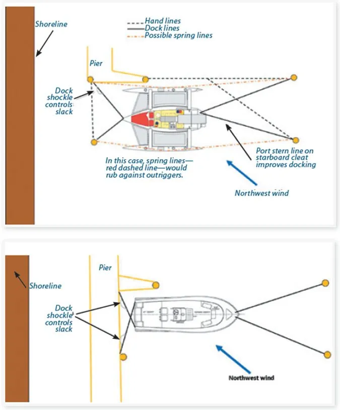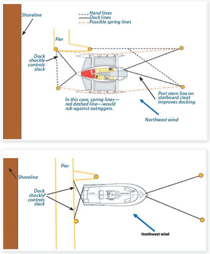 Through seemingly counterintuitive, installing Dock Shockles on the leeward side proves effective at dampening motion in slips where spring lines are impractical.