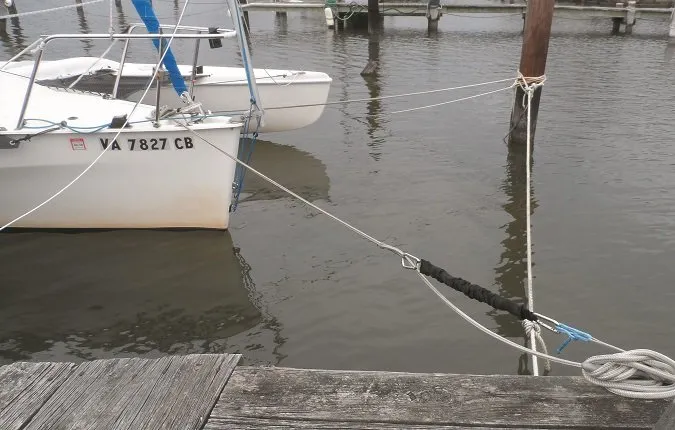 The obvious shortcoming of attempting to control slack on the leeward side is that the wind will shift and it will become the windward side. In our case, this is a minor problem, because the pier is parallel to a treed shoreline, blocking strong winds from striking at deck level. The starboard side of the trimaran is south, not a direction known for strong winds in the Chesapeake. Thus, north and west winds were our only real concern. And as you recall, we did try the Dock Shockles on the windward side; they helped a little and they will do no harm. So long as you install them so that they do not exceed their rated extension (about 15 inches) before the rope takes the load, they last for years.