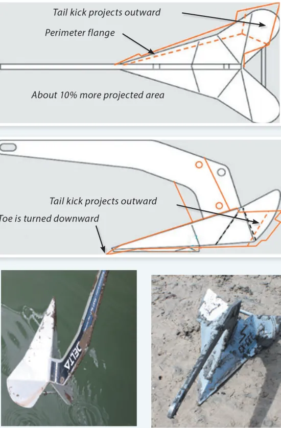 - The crease in the flukes of the Delta anchor is clearly visible in these photos from our anchor reset test. The broadest part of the flukes angle upward in a ‘tail-kick.’