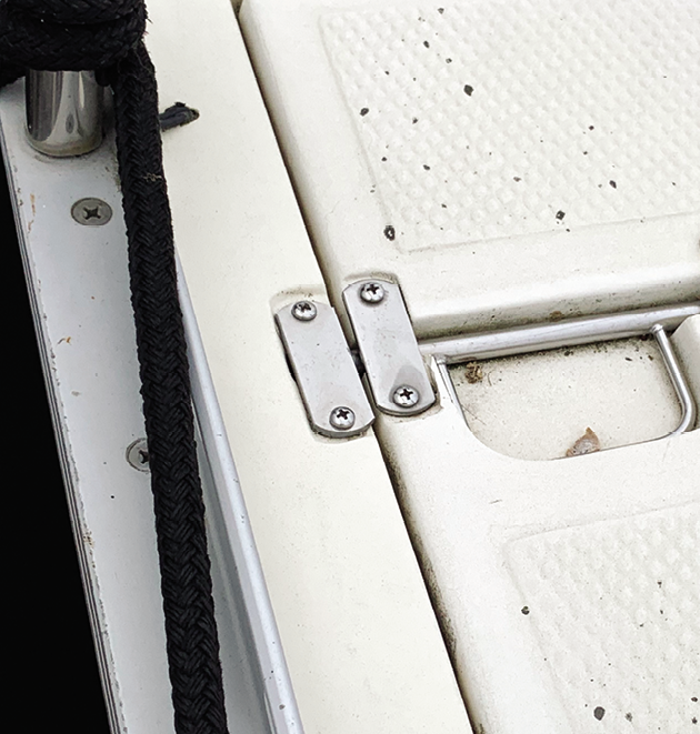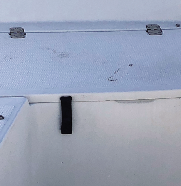 Springs are one of the easiest ways to prop open a locker lid. If you have a 1990s-era production boat, your refrigerator lid might have one—and you may have already felt that lid’s painful pinch when you accidentally bumped that spring. The spring pops into place automatically when the hatch is opened, propping the lid up. To close, you push the spring to one side by hand. The problem with spring props (apart from corrosion in the cheaper varieties) is that they close just as easily as they open. It’s far too easy to bump the spring to the side with your elbow, the gear you are retrieving, or the gear you’re placing in the locker. The result is a hatch that slams down at full velocity. The false security that this type of prop provides can be worse than no prop at all, since it invites complacency.