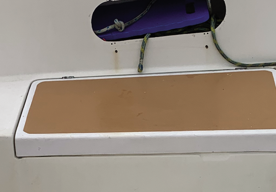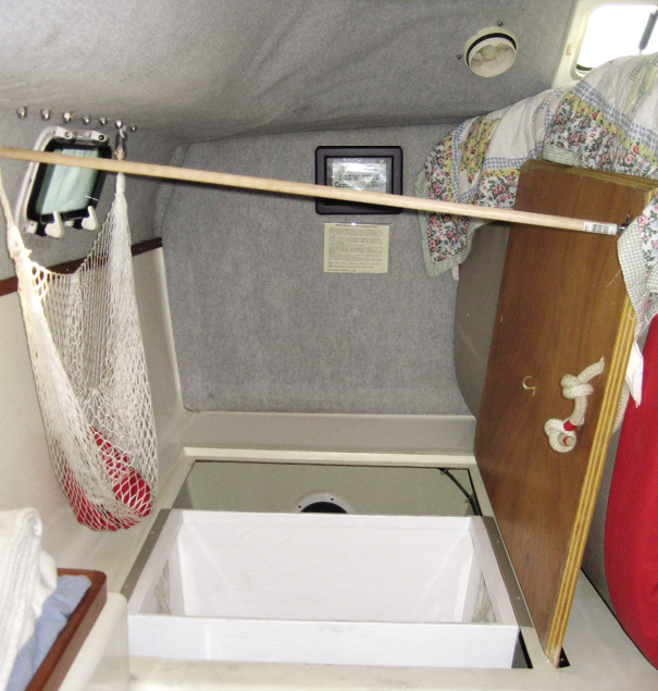 Bungee cords are commonly used as a safety line to keep hatches open. You can use a hook to attach bungee cords to the hatch, but it’s often faster and more convenient for the bungee to wrap over the lid. We use the latter method on the F-24’s anchor locker, as well as the toilet seat. Bulk shock cord from New England Ropes and Sailrite, and pre-made bungees from Davis (Mini-shockles), and Grainger (EPDM heavy duty rubber) performed well in our evaluation. Pre-made bungees from big box retailers are hit or miss—avoid the cheap multi-bungee cord packages (see “Shock Cord Test Looks at Long Life,” PS March 2022).