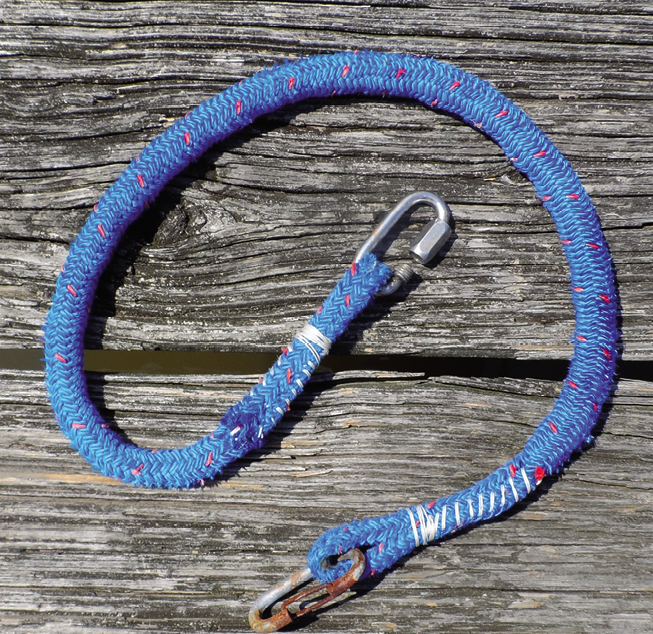 A cord with a loop that fits over a winch or hook provides a secure and easy way to secure a hatch lid. Double braided 3⁄16-inch nylon is more expensive than cheap poly cord, but it is well protected against UV and chafe. Dyneema cord is also easy to work with.