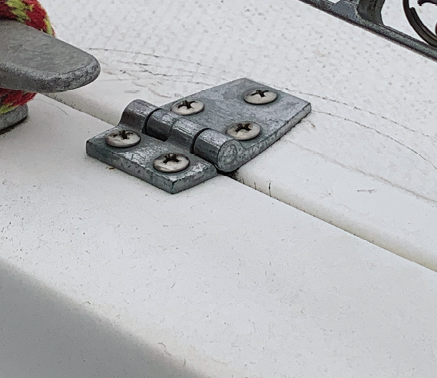 3. Stress cracks around this hatch hinge should prompt closer inspection for signs of rot or structural weakness.
