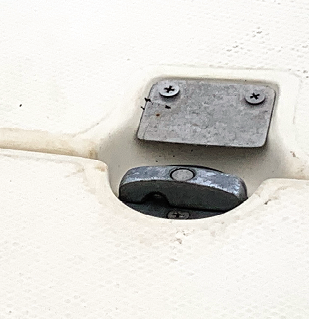 3. The twist-lock latch on this poorly-latched anchor locker relies on just two small screws to keep heavy ground tackle in place.