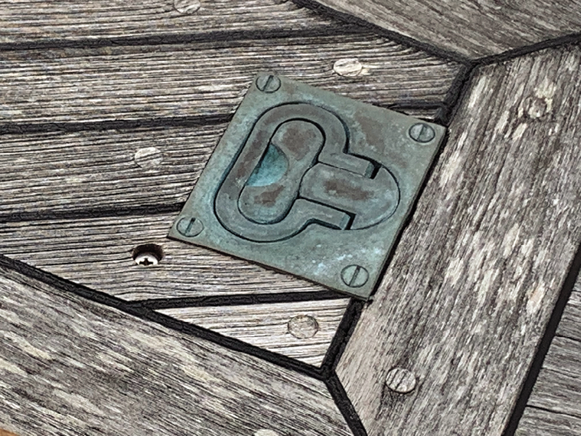 5. This neatly installed silicon bronze hardware and lock will deter thieves. Vents cut into the top hatchboard will be a vulnerability offshore.