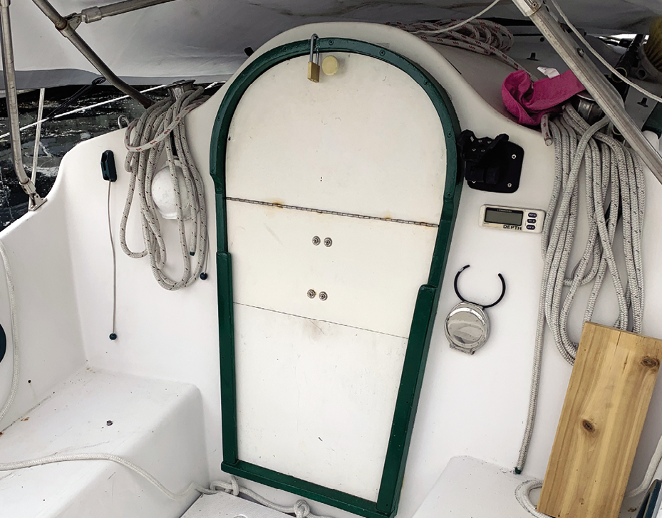 1. The companionway to this Contessa 26 has been upgraded by the owner. The hinged top panel can be flopped open, the lower panel is more than two feet off the cockpit sole.