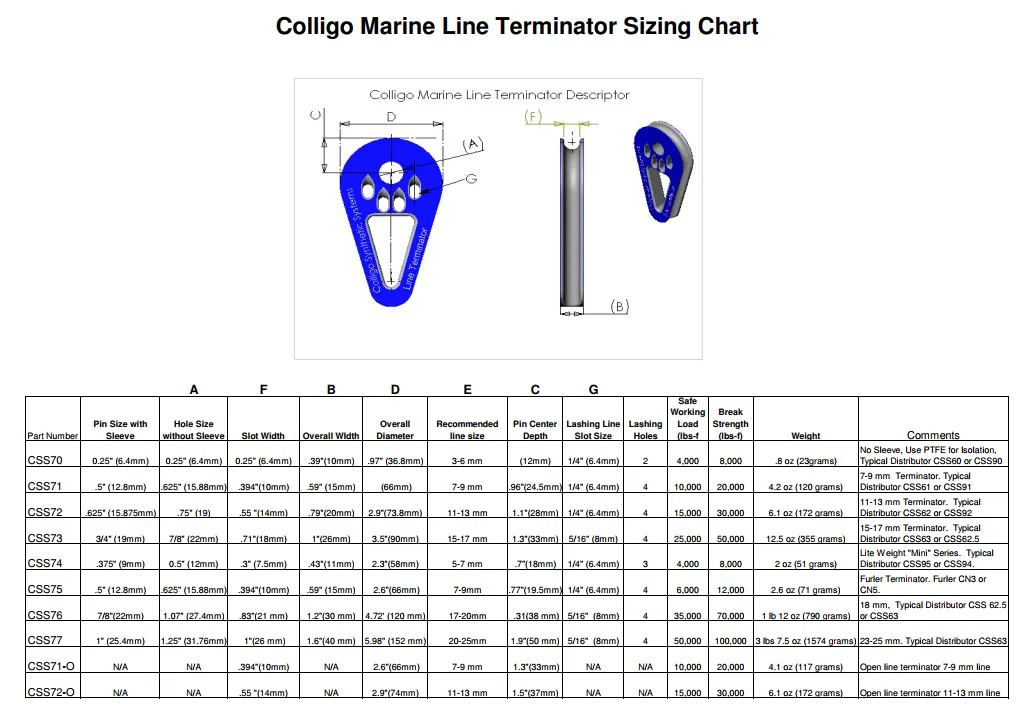 The Colligo terminators offer considerable advantage regarding inspections, both initial and ongoing; the lines are well spaced and you can see everything. Additionally, if tensions are badly imbalanced, the terminator will cock to one side, indicating the imbalance. Low friction rings will have similar imbalances, but they will not be visible.