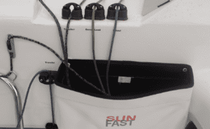 6. The Blue Performance bag keeps halyards (and winch handle) at the mast. Reefing lines are secured to deck padeyes by loops with toggles.