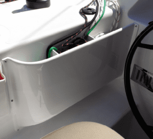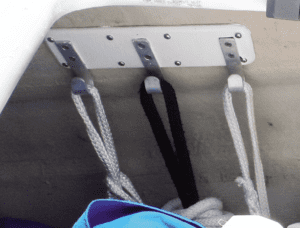 We’ve had hooks on the boats for decades and have never broken one that was properly mounted. We’ve used bags on the foredeck, where a hook would not be sufficiently secure. We’ve even tied seldom-used lines to the deck using a pad eye with a captive tie cord. We’ve been adding controls and tweaks to our F-24. The original owner’s hooks have fallen off, and the clutter in the cockpit and lockers has gotten out of hand, so we decided to add a few new hooks and take inventory of our past experiences, including both hooks and sheet bags. See “Sailboat Accessory Hooks” for results of our strength testing. We have had glued-on hooks come off many times, including practically every previous owner effort.