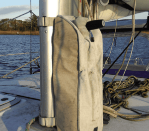 The zipper required lubrication after five years, but has been fine for a year since. The Velcro tabs on the flaps are holding up well, and none of the stitching is worn. The medium size bag easily holds the genoa halyard tail (55-ft. x ½-in. line) and topping lift tail (10-ft. x 3/8-in. line), leaving room in the top for a convenient winch handle. These are available in small ($65, 5.9 in. x 4.3 in. x 17.7 in.), medium ($76, 6.9 in. x 5.1 in. x 23.6 in.), and large ($94, 8 in. x 5.9 in. x 27.6 in.).