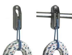 We’ve used Ronstan hangers in lockers, and they have proven quite strong. We’re not fans of screw-on fasteners, the hook can snag other lines, and it must be removed to adjust or replace the cord. Still, they are durable and versatile. $10 for two.