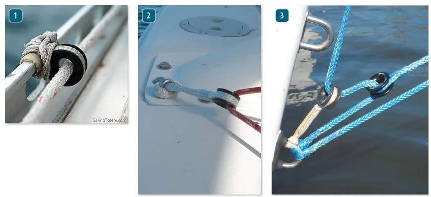 1. No splicing talent? No problem. A luggage tie knot (top) or some seizing (bottom) can secure rings in a pinch. A small strop turns the ring into lightweight lead that can be moved around the deck (middle).