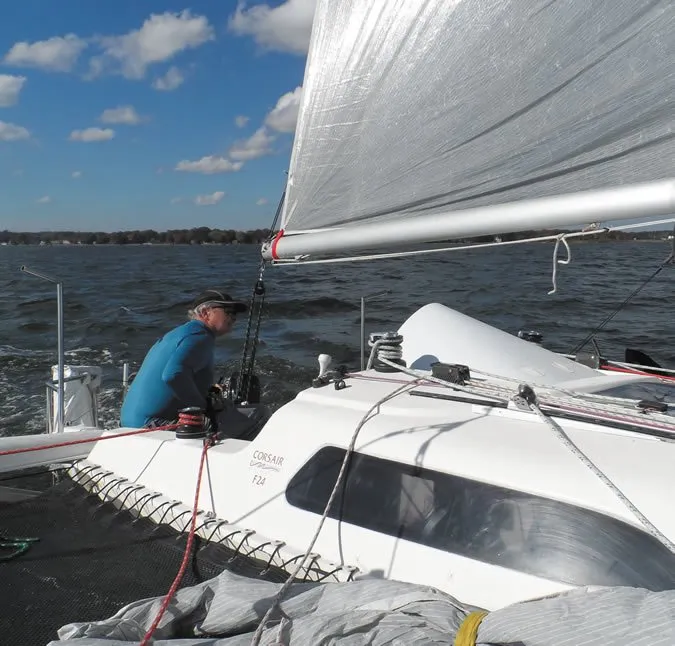 For my new-to-me boat, a Corsair F 24 trimaran, I envisioned a streamlined mini-dodger that would offer protection from spray and rain from forward or straight down. Access would be fast and it would not interfere with sailing, or add windage or weight.