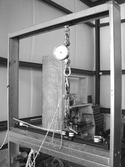 For our initial experiments regarding side force, we mounted a spare track and traveler car at the top of our jig and attached a Dillon dynamometer to it. The mainsheet purchase from the car and track under test was led up to the dynamometer. We put the mainsheet under a load of 400 lbs. and led the 1:1 traveler control line outside the jig via a hole bored in its side to a spring scale (see photo at right). Then, by way of repeated pulls, we quantified the force necessary to pull the car along the track. We learned early on that the force required, given this configuration, was almost inconsequential. In most instances it didn’t exceed 12 lbs. to start the car rolling, and once rolling, the force required to pull it was much less than that. This, we surmised, is a testament to the engineered efficiency of the bearing systems used in these travelers.