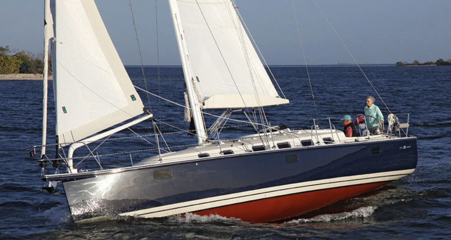 Despite having a separate trysail track on the mast, the trysail stays in the bag. Two deep reefs have done the job in all the conditions we have encountered, although we have sailed off the wind with no mainsail at all a few times. For offwind sailing in really heavy air—over 35 knots—a scrap of rolled-out genoa will keep the boat tracking better than a staysail by shifting the center of effort further forward.
