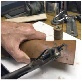 Being a team of diehard do-it-yourselfers, we decided to try our own hand at devising a workable solution to defeating line chafe. After fiddling with canvas, old fire hose, and even messing around with some Kevlar, we settled on leather—an old rigger’s standby. It proved to be rugged and remained unholed after a ride on the belt sander. The fabrication process was kids craft 101, and there was something quite seafaring about the result.