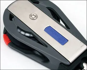 Whereas Harkens, Seldns, and Ronstans on/off switches are tiny, Wichards is a large bar that slides easily back and forth, pushed at either end. The block is quite large, too, weighing roughly twice that of the others. It is robust, and has a high safe working load of nearly 2,000 pounds-three times more than most of the other blocks.
