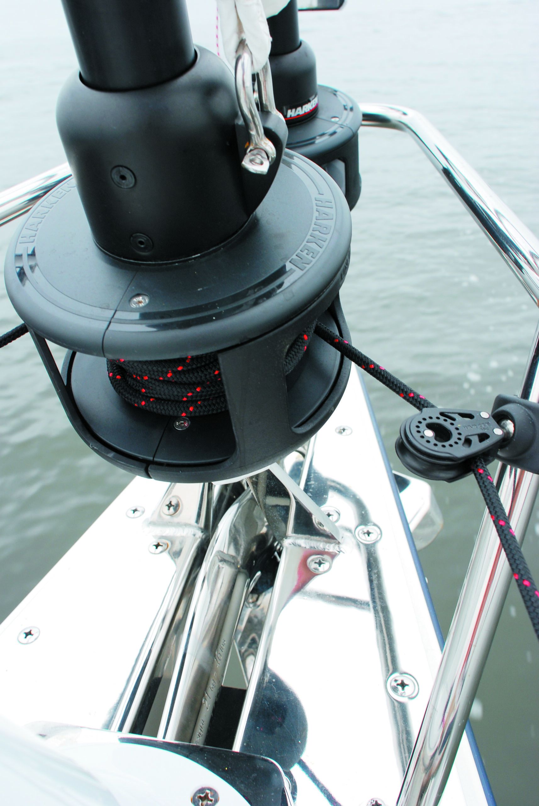 Ideally, this block should be located on the stanchion so that the sheave that handles the inhauling line, which imposes the most load on the block and stanchion, is below the outhauling line. Poor alignment of this block can cause the line to rub on the stainless-steel side plates or bushing surfaces, causing a significant increase in friction.