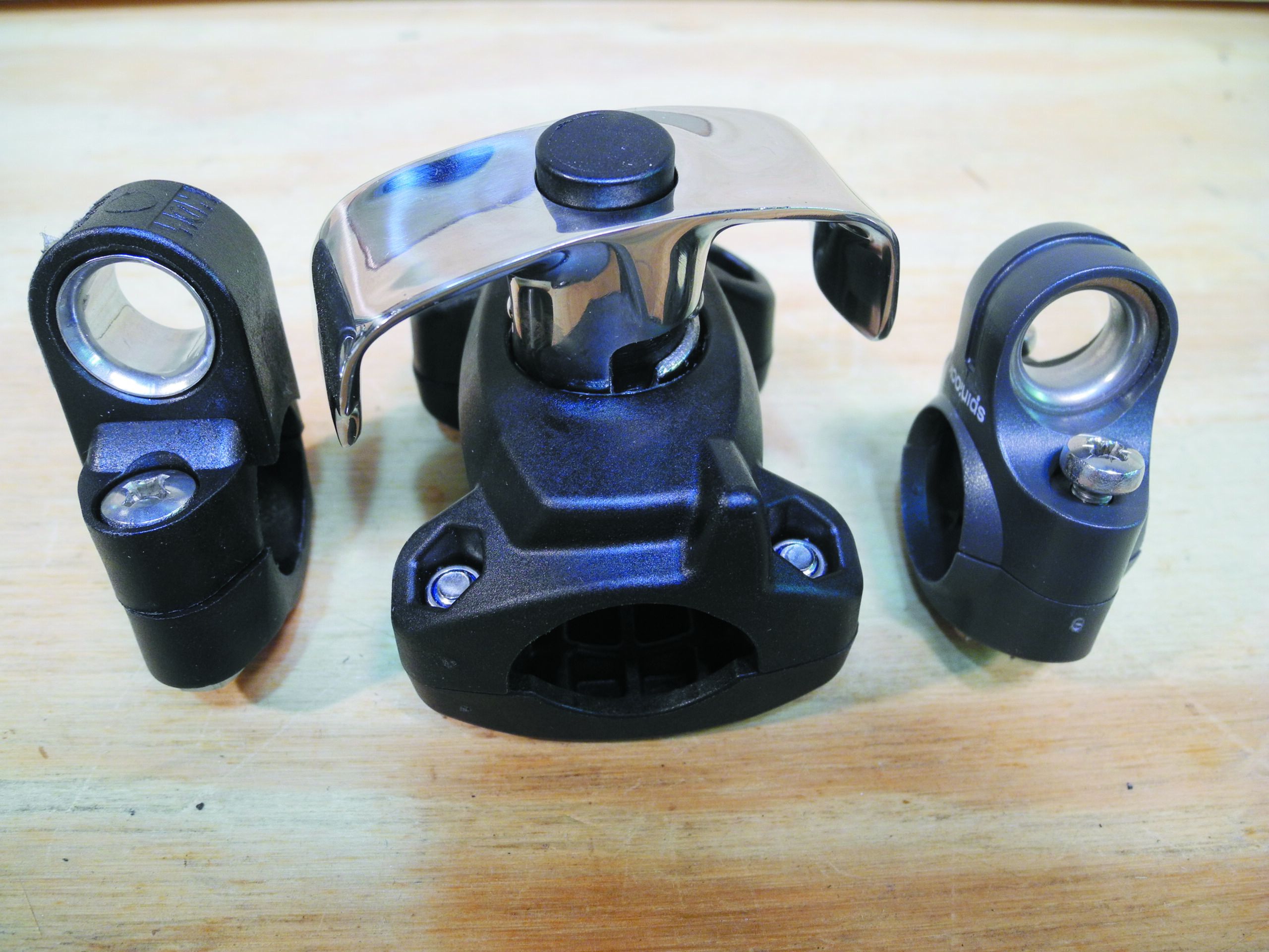 Two Nautos products that we tested, the HT-450A and the 92388, use the same two-bolt clamp. Each offers a single-plane tilting feature combined with a swivel function. These are well suited for stanchion-to-stanchion line guides. Both are bargain-priced, and the small-sheave bushing version (HT-450A) comes with a pull-pin to release the sheave. This feature, which lets you release the line from the block without threading back through it, could come in handy when trying to free a line that is hockled, knotted, or snagged. It will also benefit those who berth at a dock and like to stow the lines forward when alongside to reduce the trip hazard when boarding. The Nautos 92388 features a smooth-spinning, ball bearing race and is reinforced with stainless-steel straps.