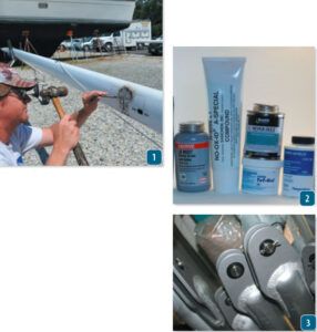 It helps to have a good magnifying glass, a pick, knife and small scraper on hand to expose and inspect oxidized areas. Place a piece of contrasting color masking tape on each point of concern as you progress toward the masthead. Once the inspection is complete, use a digital camera or smartphone to document the more serious issues. These snapshots provide a record of the location and extent of all corrosion, deep pitting and any cracks emanating from fasteners or hardware. Also record all dents or other impact damage and any sign of ongoing abrasion. Serious damage can be caused by misled wire running rigging and the cycle loading wear linked to variations in tension. Naturally, all standing and running rigging should be thoroughly inspected at this time— a topic of a future article.
