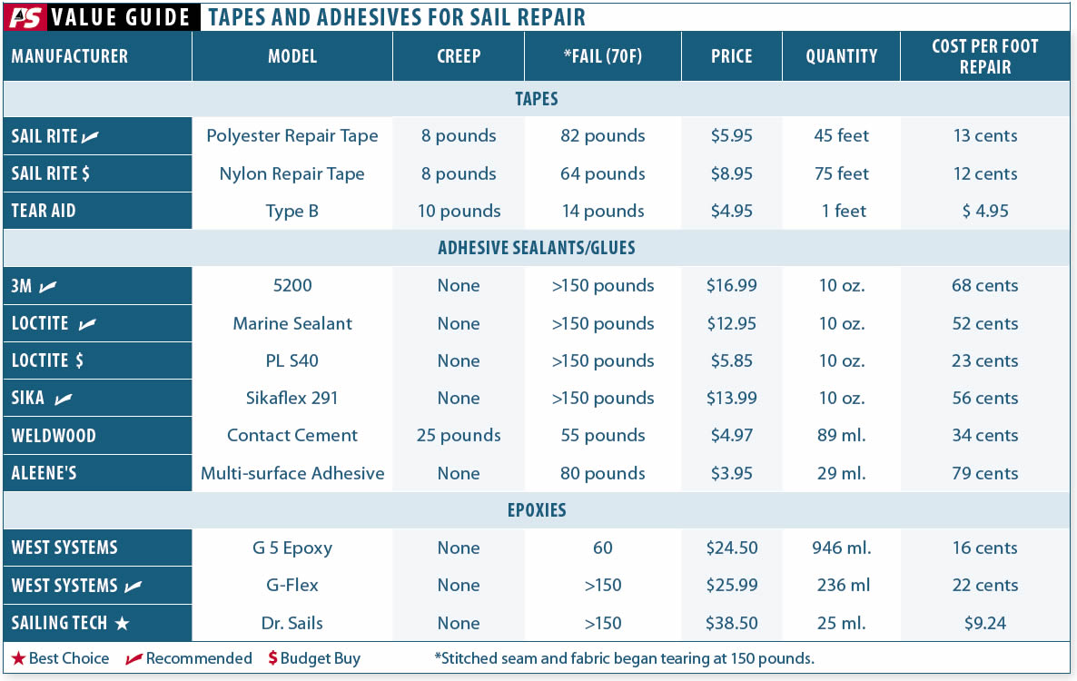 Several sailmakers we spoke with agreed that tapes and glues play a key role in sail repair and maintenance. They shared long tales of repairs in which the cloth was too old to take stitching, where a sewn repair would require too much disassembly and reassembly for the labor to make sense, or where tapes and adhesives were used as adjuncts to sewn repairs. Weve repaired shredded chutes, patched luff tapes, replaced tell-tales, and repaired race damage, all in field conditions, but we were never sure what could have been better or just how strong a given repair really was. Time for some numbers.