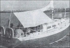 The idea I hit onis a simple, slightly tapered, battened awning tied to the backstay bridle aft, and held forward by lines running to lifeline stanchions on either side. The forward end is held up by a line permanently fixed about ten feet up the backstay. This line has a halyard clip at its lower end, and when not in use, clips out of the way to the backstay turnbuckle.