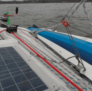 An optional anchor point would be a U-bolt just forward and inboard of our slider. This would allow in-hauling without having to drill holes. We also could have anchored to the mast base, although this may be too far forward on some boats.