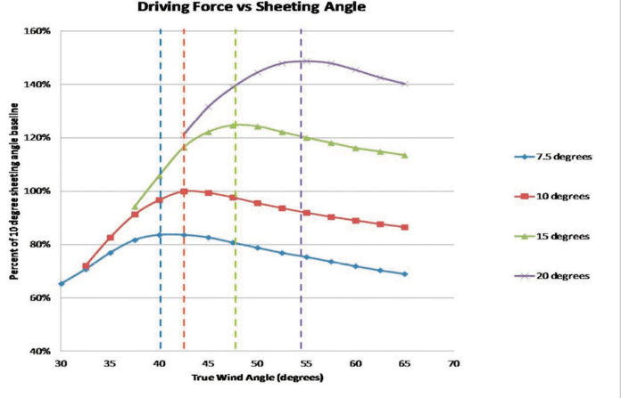 After considerable testing, in a range of wind and wave conditions, we determine the best average sheeting angle for our 34-foot PDQ catamaran is 12 degrees and the best angle for our F-24 trimaran) is 11 degrees.